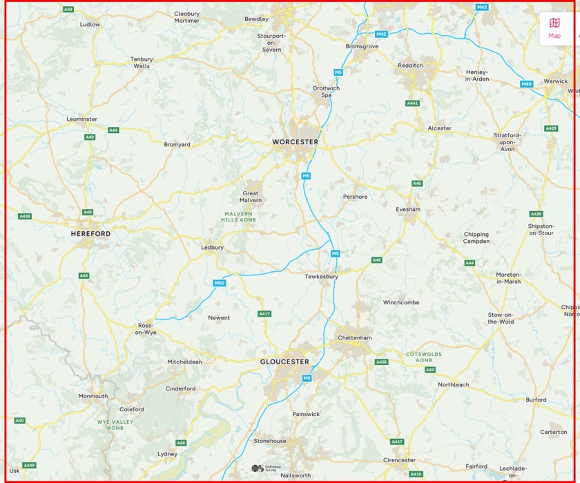 I can travel for an hour, or slightly over, in any direction from Great Malvern in Worcestershire. The map below gives a rough idea of the area I cover.