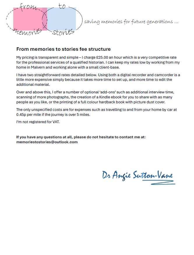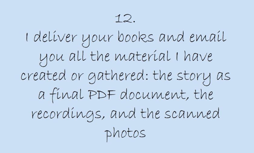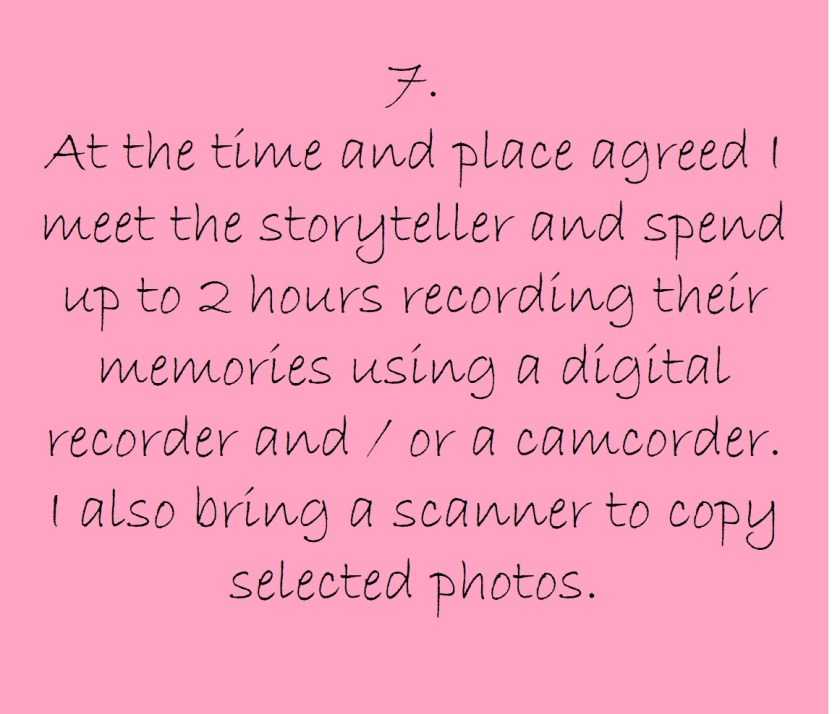 The story you commission from me will be the culmination of a detailed and sensitive memory-gathering process. Allow a minimum of 4 weeks from first contact to receiving your finished book or books. The time the process takes is dependent on numbers of memory gathering sessions and the finished product. Below is a simple guide of how I will work with you: