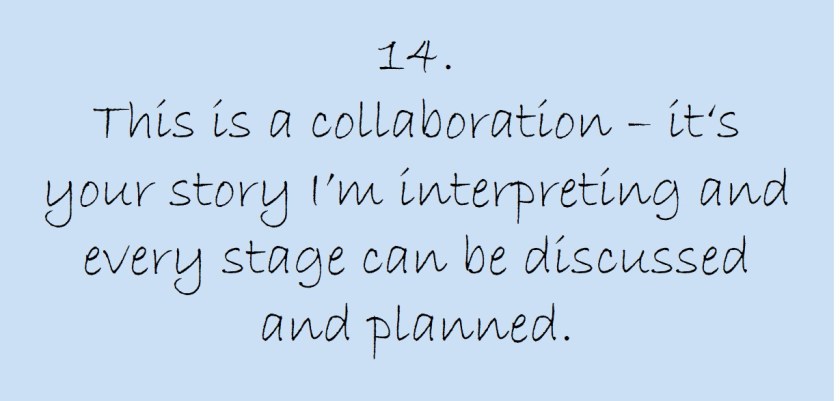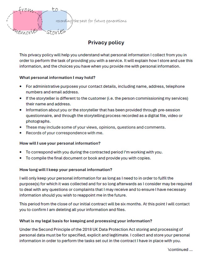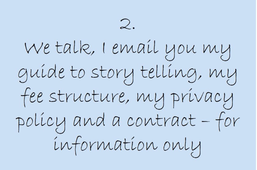 Below are 4 key documents: my privacy policy, a complete guide to telling your story, my fee structure, and a sample contract. Click on each one to open.